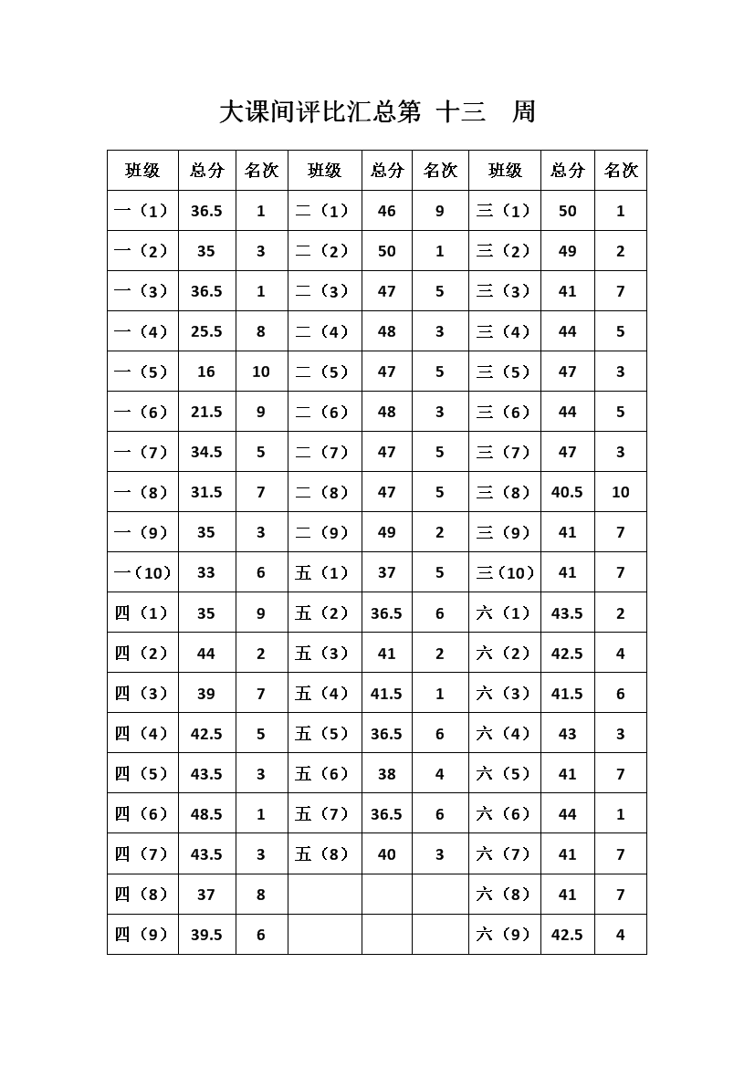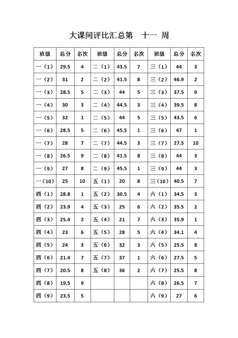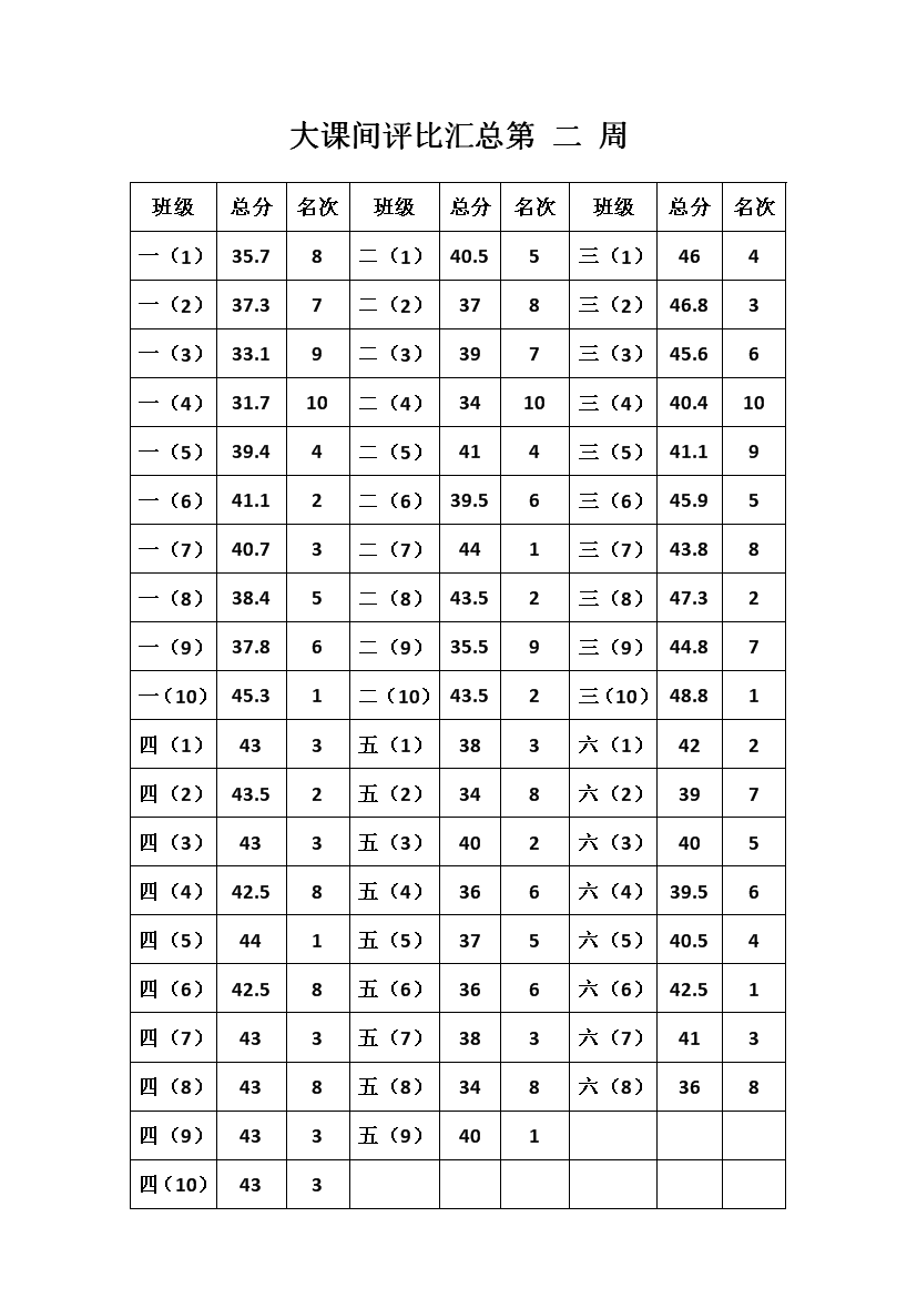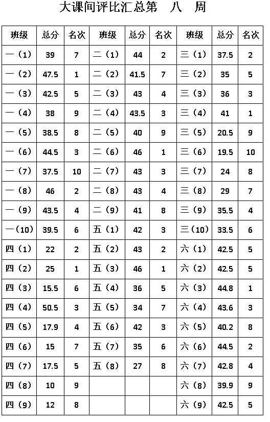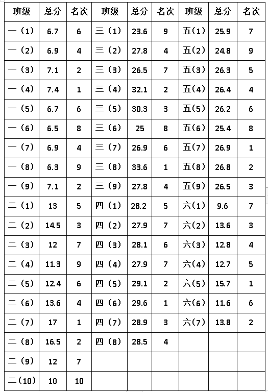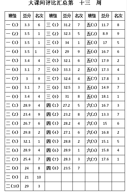 禄口第二小学阳光大课间评比汇总表第十三周(下)