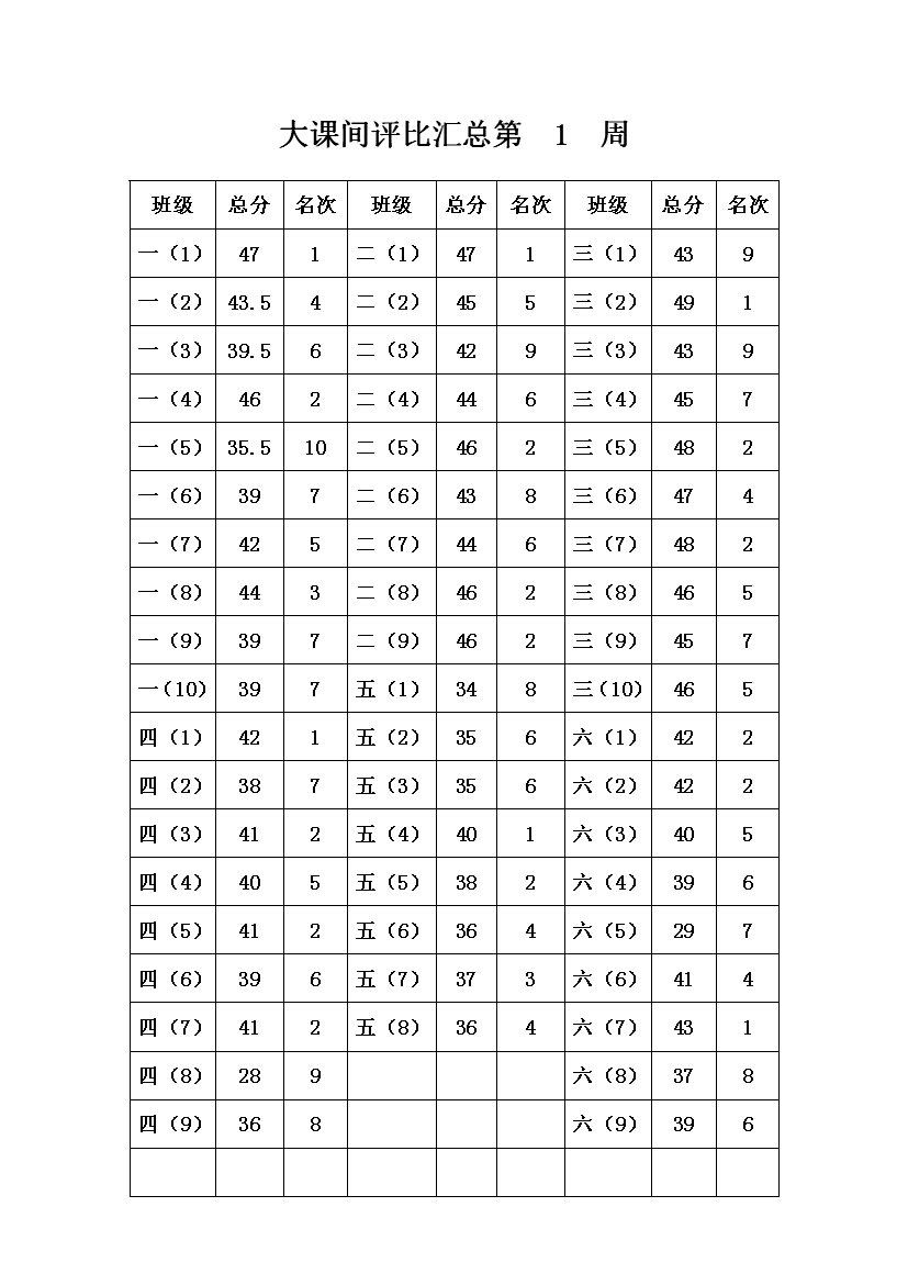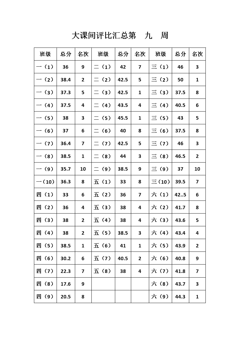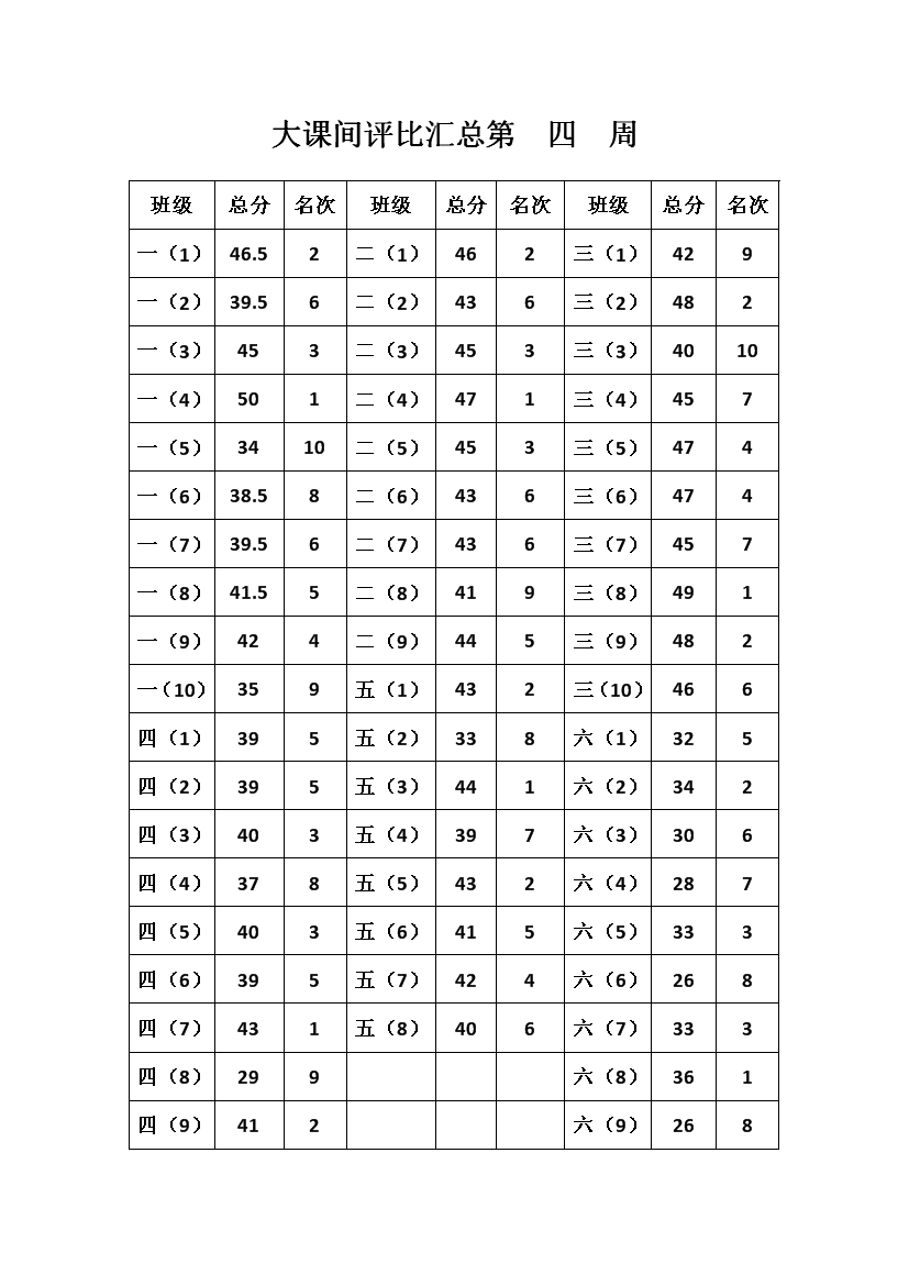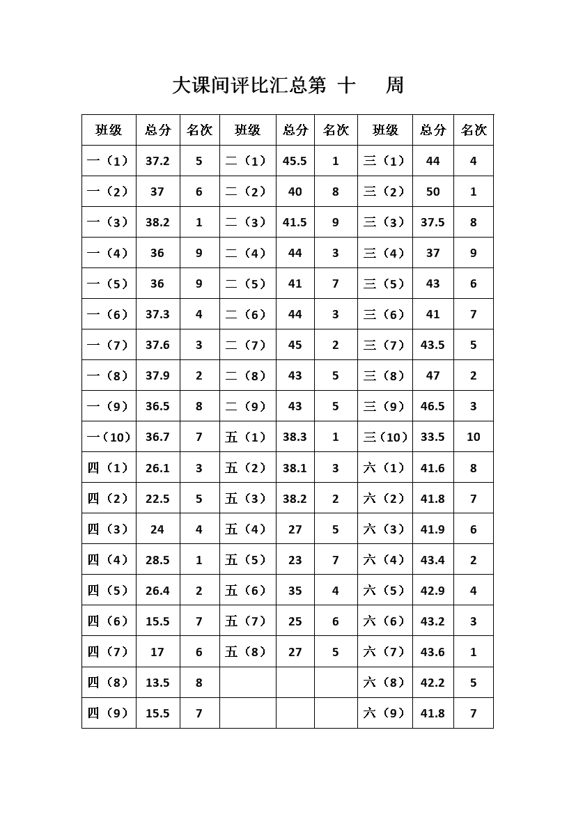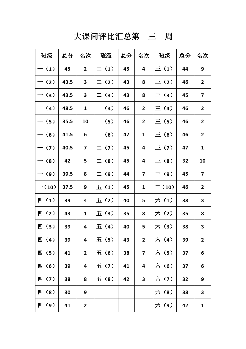 禄口第二小学阳光大课间评比汇总表第十三周(下)