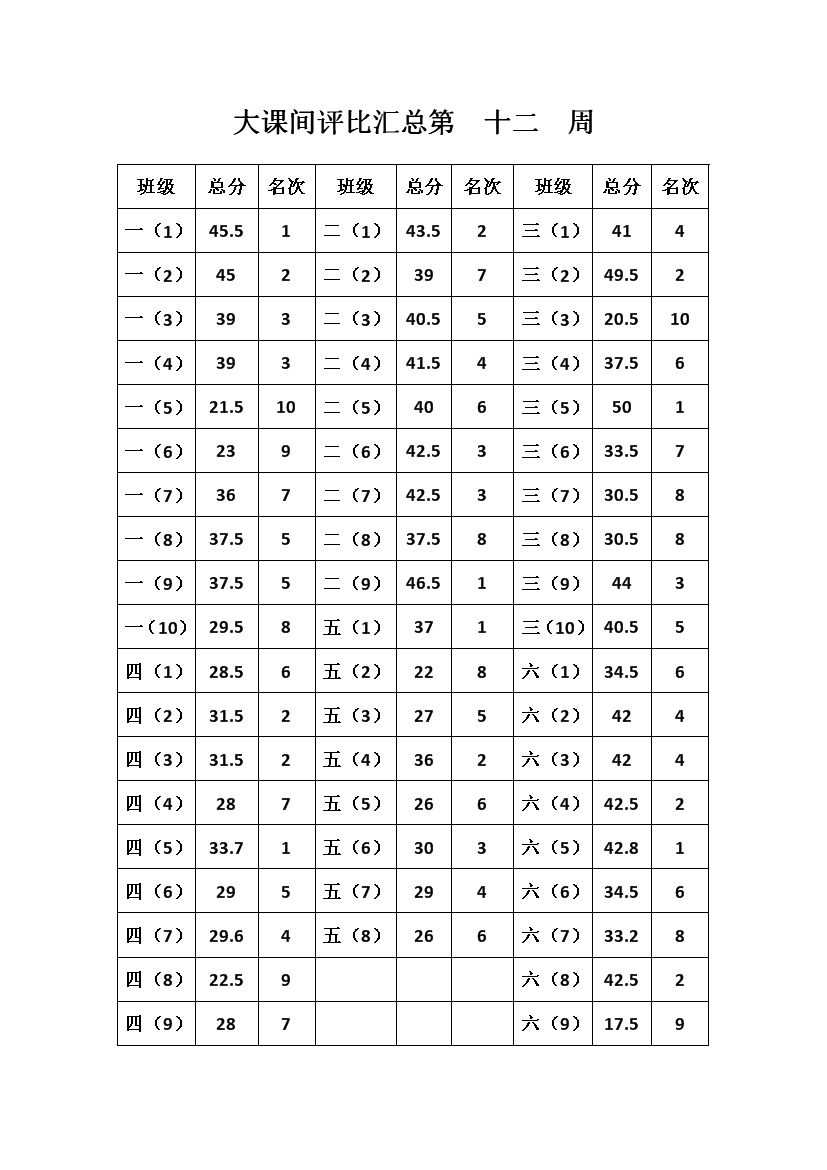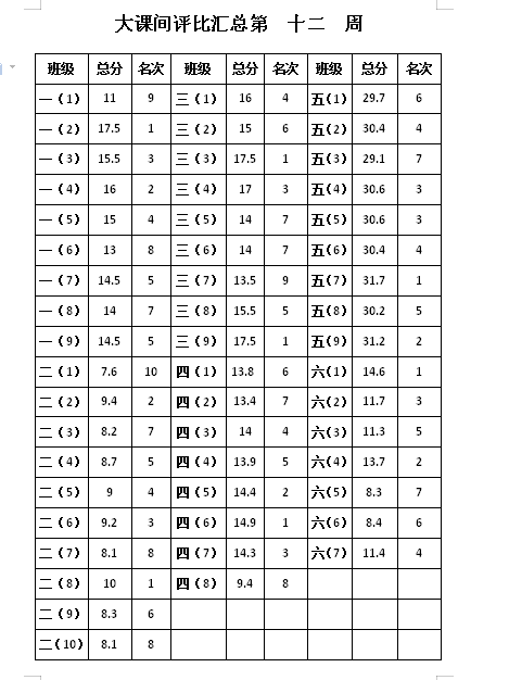禄口第二小学阳光大课间评比汇总表第十二周(下)