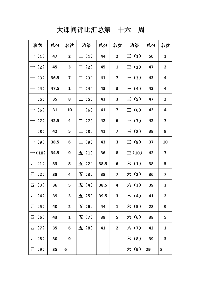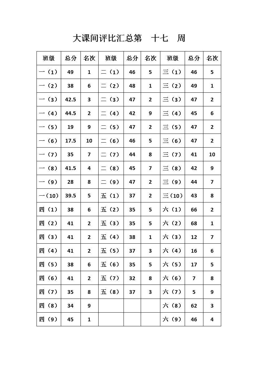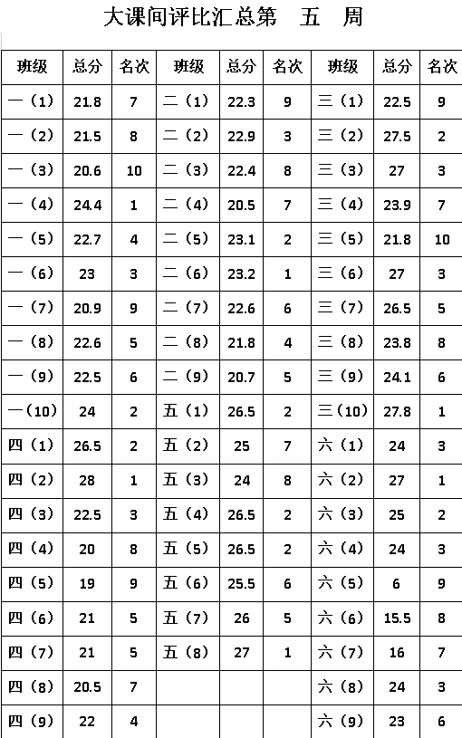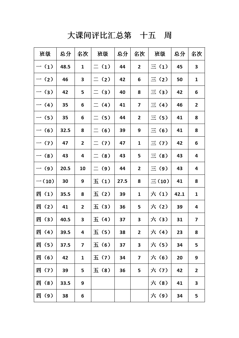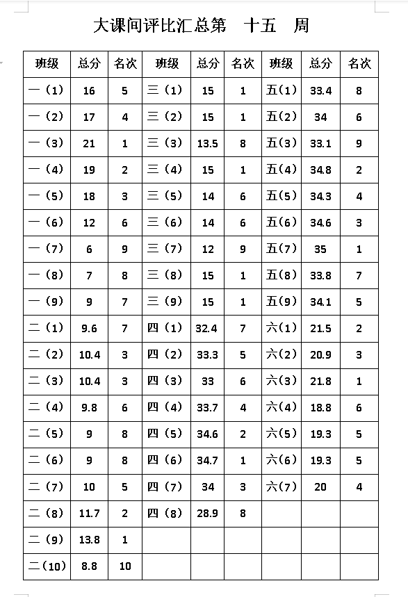 禄口第二小学阳光大课间评比汇总表第十五周(下)